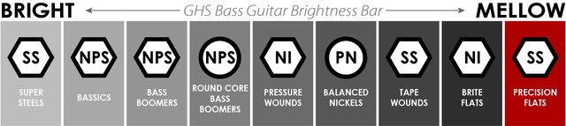 There seem to be a lot of flatwound bass strings on the market that feature a bright tone that's closer to a roundwound string. In fact, some are even advertised that way, but when I choose a flatwound bass string I'm looking for what I call the original Fender Bass sound: smooth and punchy with a strong fundamental and a slightly percussive attack. GHS Precision Flats are one of the strings that delivers this sound, and without too much tension (I choose the M3050 set). They also have a smooth outer surface which is important, as some other brands of flatwounds have an unpleasant "sticky" feel due to the gaps in the outer windings. I've heard people say that these are closest to the original strings that came on vintage Fender basses, and they certainly seem to capture that sound.